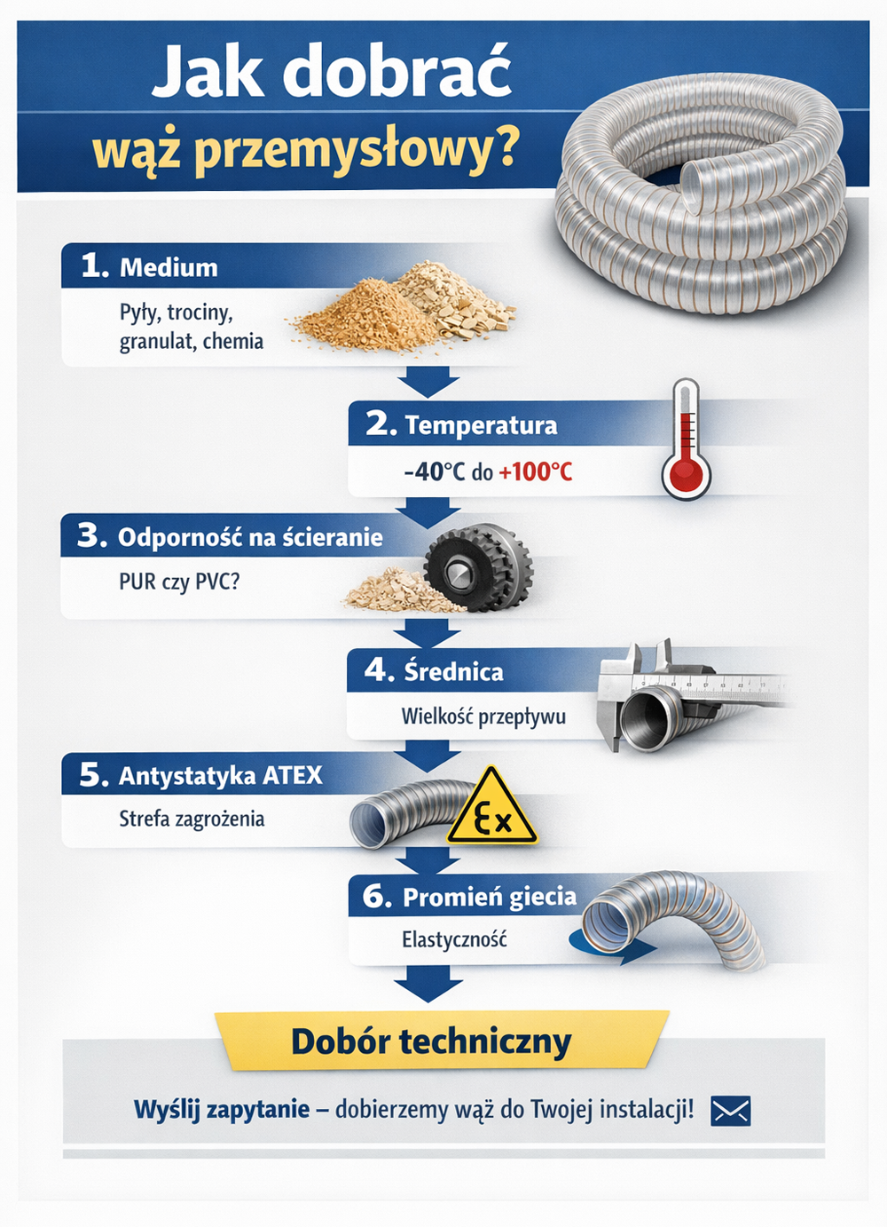 Dobór odpowiedniego węża przemysłowego ma ogromne znaczenie dla bezpieczeństwa instalacji, jej trwałości oraz efektywności pracy. W wielu zakładach produkcyjnych węże są elementem systemów transportu pneumatycznego, instalacji odpylania, odciągów technologicznych czy transportu materiałów sypkich.